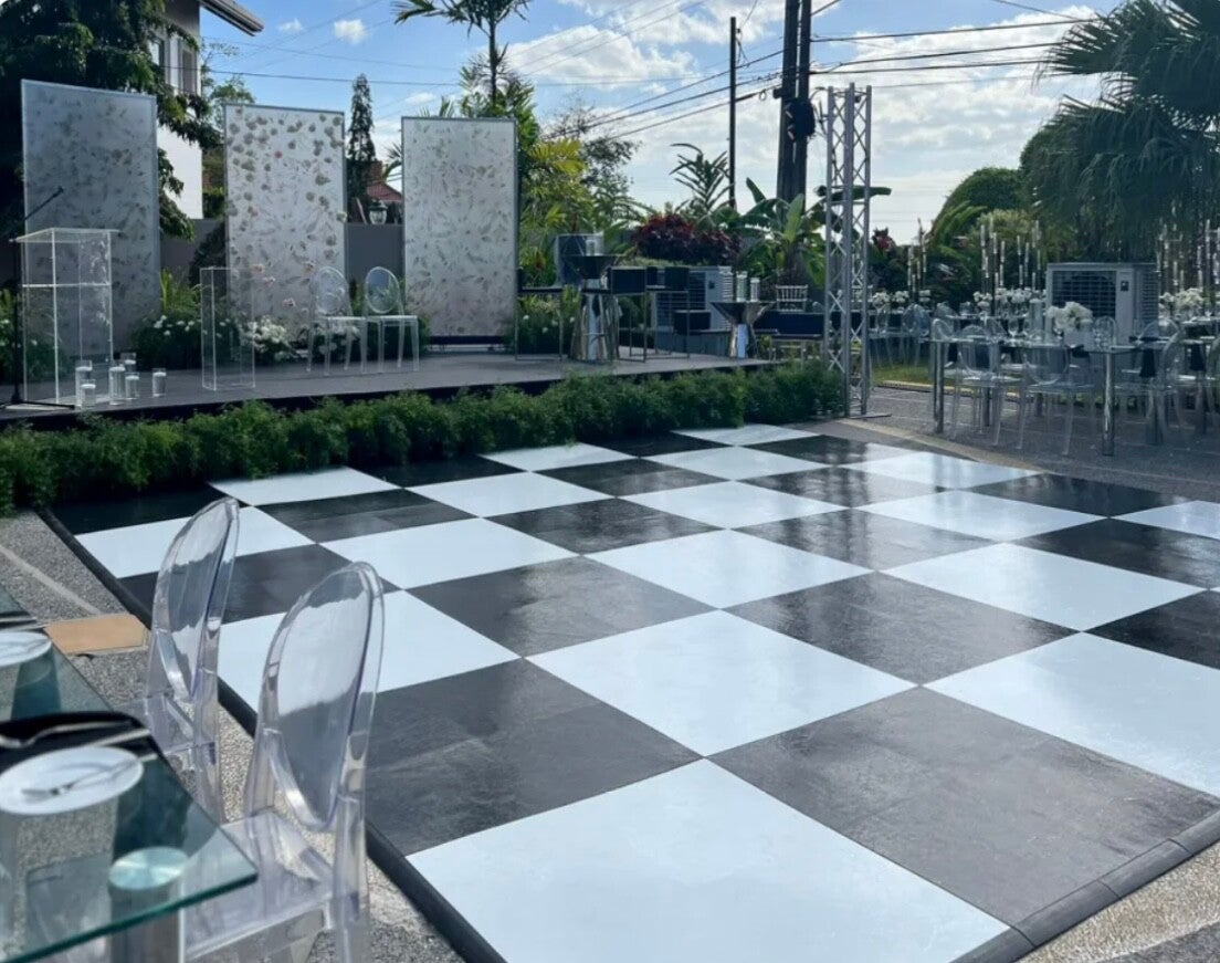 Add timeless style to your event with our premium snaplock vinyl dance floor. Its black-and-white checkered design creates the perfect statement piece for weddings, parties, and celebrations. Lightweight yet durable, it assembles quickly and can be set up on virtually any ground surface (including grass) for a smooth, sturdy dance space anywhere.